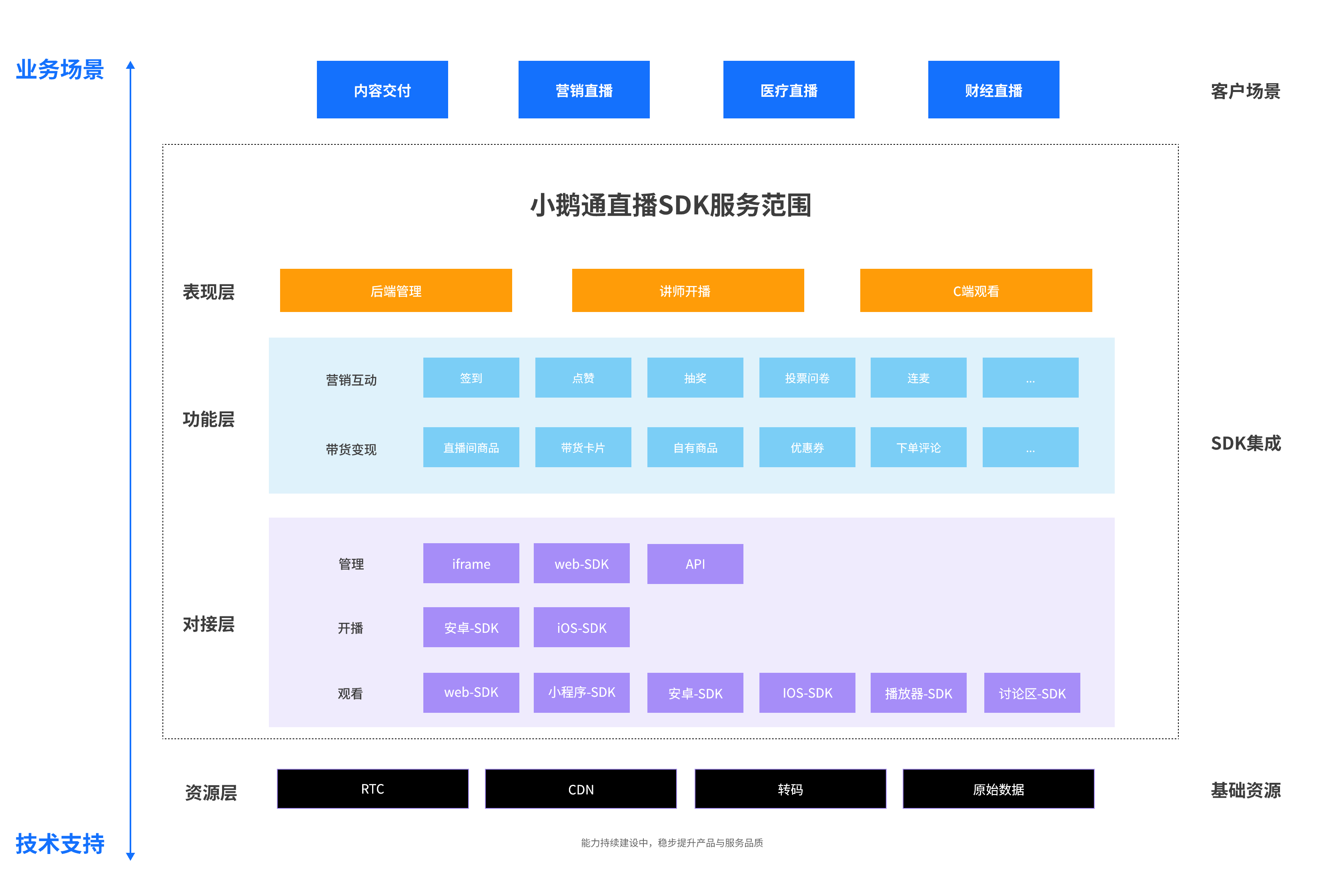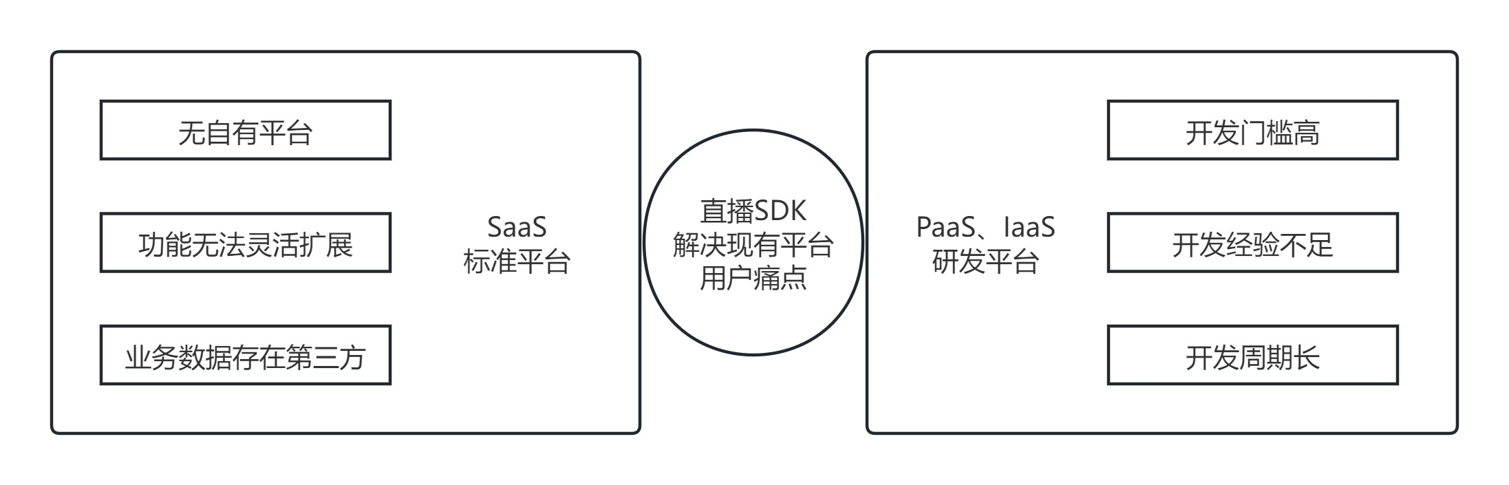 通过接入直播SDK,需求方可根据业务需要通过低代码甚至零代码定制企业专属直播应用,优势是周期快,成本低,定制程度高