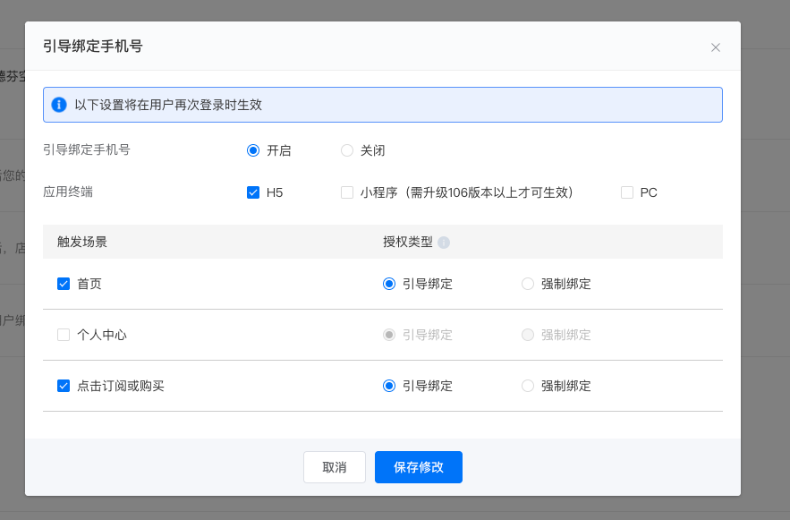 - H5店铺必须打开强制绑定手机号,因为小鹅通H5店铺是默认微信登录,不强制绑定手机号的,只有打开强制绑定手机号,您的小鹅通所有用户账号都是拥有手机号的,App这边做账号打通用手机号即可。
