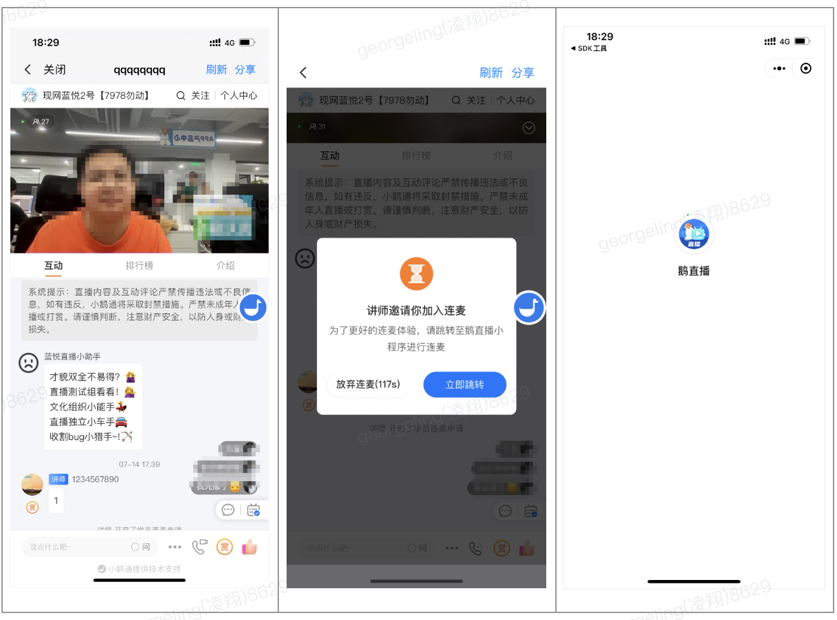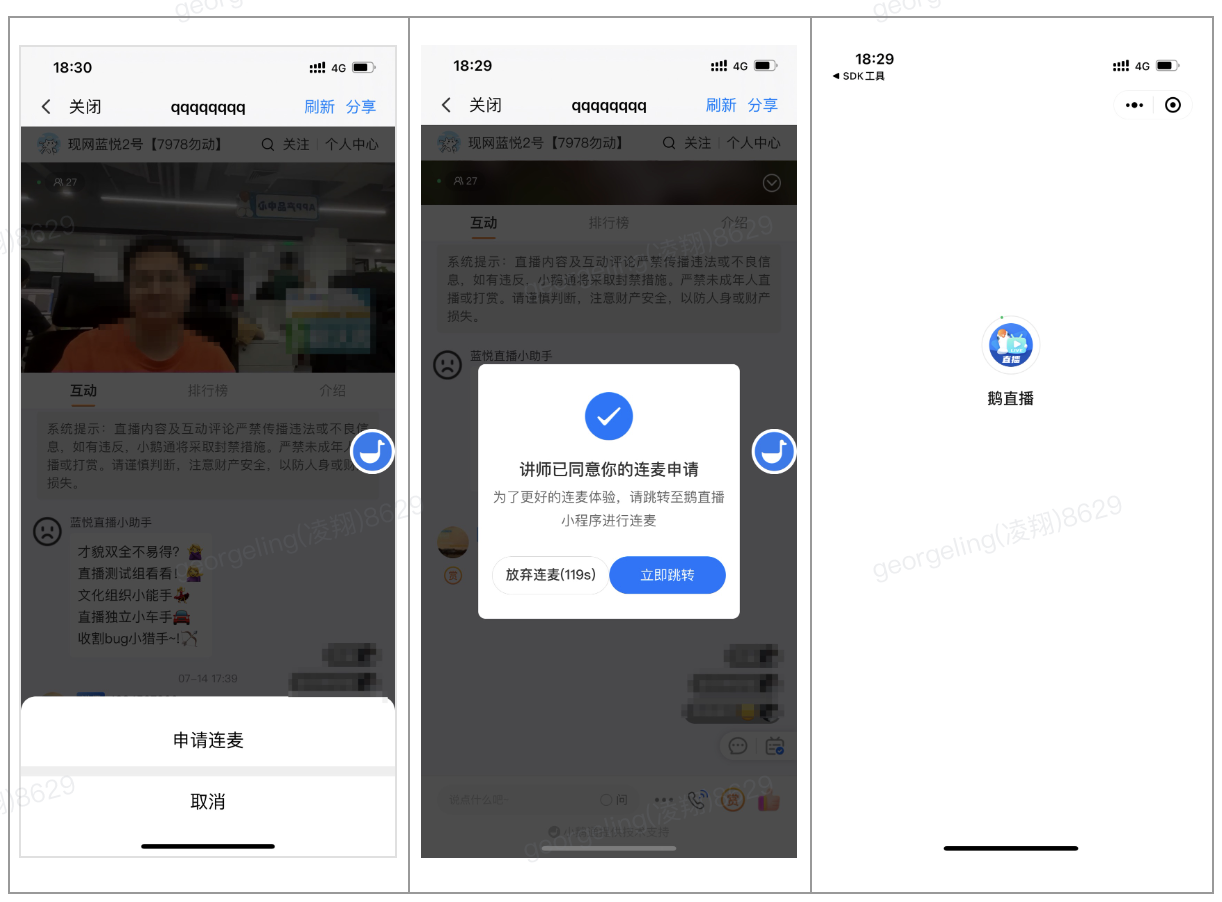 - 点击立即跳转则拉起鹅直播并进入直播间进行连麦。