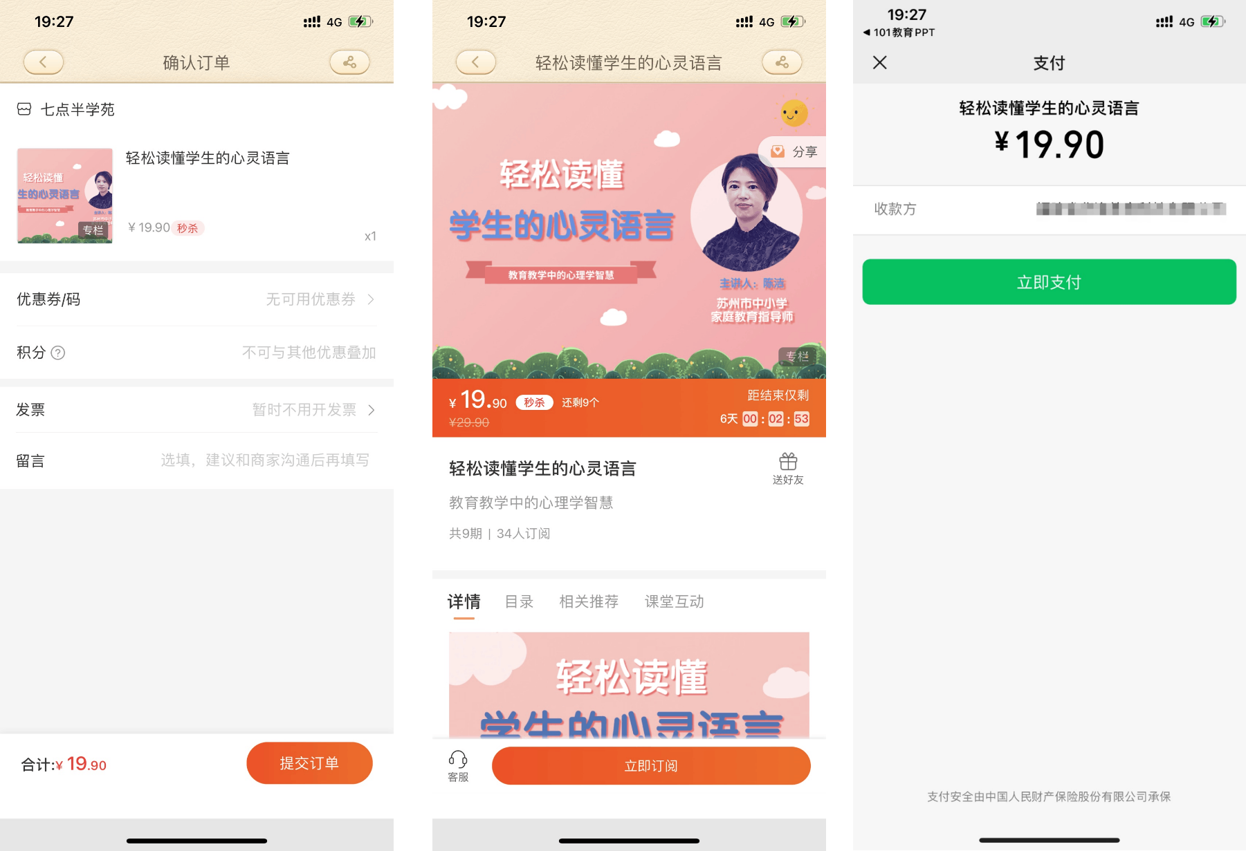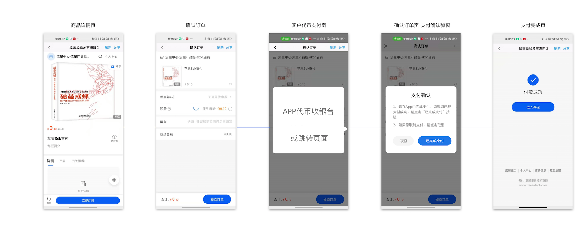 优点:App内全闭环,适合App支付功能相对完善,并且支付后有各种特殊续期逻辑的情况,因为支付流程完全在App自己掌握,最终调用一个API通知小鹅通给用户开通课程权益即可。