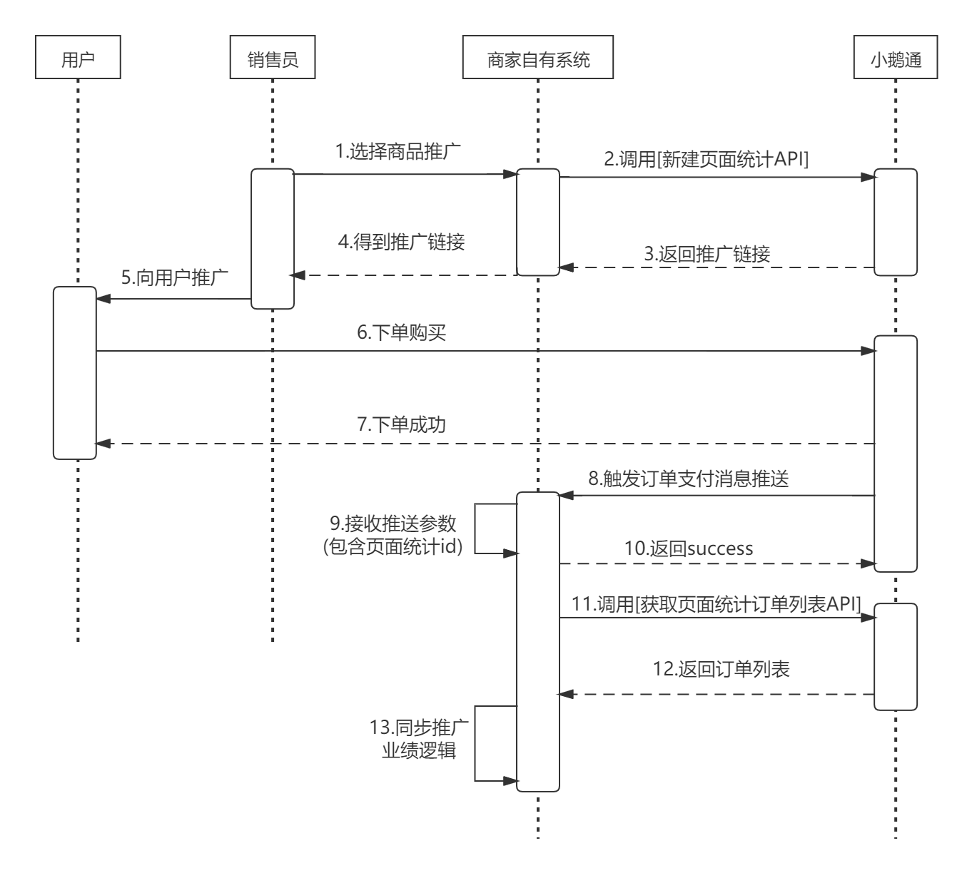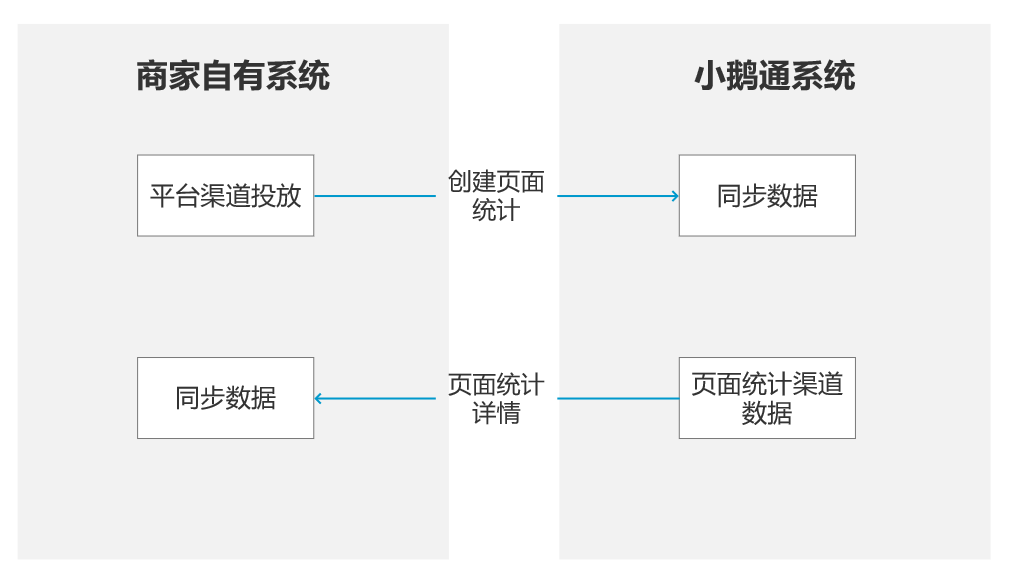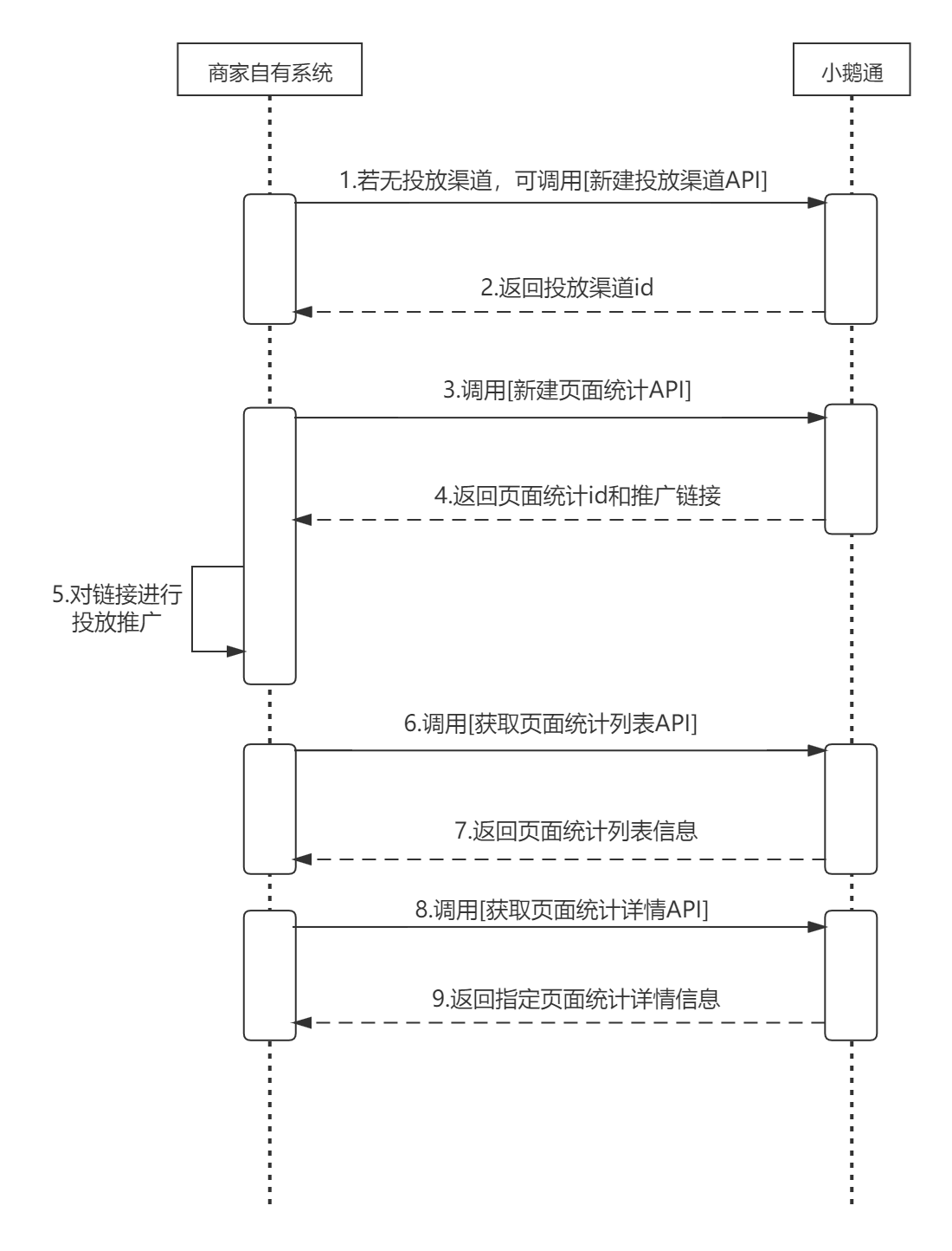 商家在自有系统中有各推广渠道希望同步至小鹅通页面统计中,并获取相关渠道统计数据,用于后续运营中。如:商家系统有独立的分销体系,通过小鹅通的页面统计功能,能监控不同分销渠道的效果数据以及进行业绩结算。