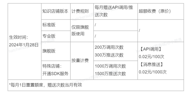 尊敬的小鹅云开发者: 为持续向商家开发者提供高品质的技术服务,不断完善开放平台的功能,保持开放能力的稳定性,小鹅云将于2024年1月28日起,仅开放给“旗舰版”知识店铺使用; 针对使用小鹅云开放服务的老用户,给予一定的宽限免费期(截止至店铺当前有效期内),暂时不做收费,宽限期结束后则正常收费。 具体细则如下: